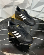 Stride in style with these black 3 stripe sneakers. With a sleek and classic design, these sneakers will elevate any outfit. Comfortable and durable, these sneakers are perfect for everyday wear. Make a statement with these trendy and versatile shoes.