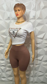 "Experience the perfect blend of style and comfort with our Brown & White Leggings Set. This biker-inspired set features a bold brown and white design, paired with a classic white tee adorned with a delicate floral pattern. The earth tones of the leggings give a natural and chic touch. Get ready to turn heads with this unique and trendy look!"