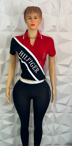 Colour Introducing our Polo colour block leggings set - the perfect combination of style and comfort. With a classic Navy, Red, and White polo tee paired with navy leggings, this set is sure to turn heads. Stay stylish with this unique and playful combination.