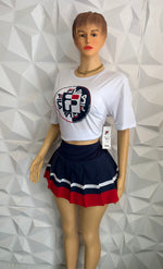 "Add a touch of authenticity to your wardrobe with our skirt set complete with a regular t-shirt in classic white, navy, and red. Crafted with quality materials, this set is both stylish and comfortable. Perfect for any occasion!"