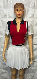 Upgrade your wardrobe with our Diva skirt set. Featuring a stylish polo top and a pleated white skirt, this set exudes elegance and sophistication. The rich colors of red, navy, and white make it the...