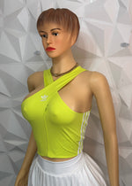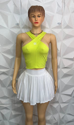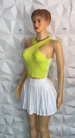 "Turn heads with this criss cross lime green top and white skirt set. The sexy lime green top pairs perfectly with the playful pleated skirt, creating a unique bold look that will make you stand out in any crowd. Get ready to feel confident and stylish in this fun and flirty outfit!"