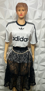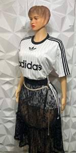 Unleash your bold side with our Midi Mesh Set! This stylish white tee is paired with a luxurious mesh midi skirt, featuring a striking stripe detail down the side. Perfect for adding a touch of luxury to your wardrobe. (Fierce and fashionable! Luxe meets sporty-chic.)